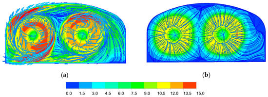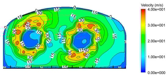 The data in Table 2 also shows that the TP difference value between the inlet and the fans’ entries is negative when Q < 70 m3/s. To make a contrast clearly, the velocity distributions at the positions of fans’ entries are plotted in Figure 9, under the condition of Q = 60 m3/s and Q = 80 m3/s. It can be found that the rotating flow phenomenon occurs with uneven velocity distribution when Q = 60 m3/s, whereas airflow converges into both fans without a revolving tendency when Q = 80 m3/s. It indicates that the airflow will be forced into the state of swirling with an unstable operating point when Q is less than the minimum rated air quantity, and the rotating flow phenomenon brings about the increase of air pressure near the fans’ entries compared with the pressure at the inlet, so the TP difference value between the inlet and the fans’ entries becomes negative. Moreover, the increase of pressure may raise the stress on fan blades, which easily triggers several adverse effects, such as shell vibration and fan overload, so it is necessary to avoid the low flow-rate operating point.
