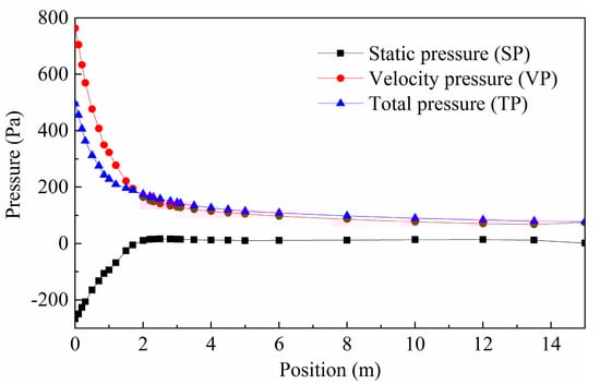 Considering that pressure directly determines the variation of the shock losses in a PFS, several cross-section average values of static pressure (SP), VP and TP in the return airway were monitored, as shown in Figure 10. It can be observed that the absolute values of SP, VP and TP reach their maximum at the position of fans’ exits (position = 0); and these parameters are changing remarkably within the position from 0 to 3.0 m, and changing gently with the position from 3.0 to 15.0 m, even remaining basically unchanged. Three curves are close to zero with the position increasing. At the outlet, the average value of SP rises to 1.51 Pa, and the average values of VP and TP sharply decrease to 73.93 Pa and 76.93 Pa. It indicates that a part of air VP is transformed into SP along the return airway, and another part of air VP becomes pressure loss due to the TP also decreasing. The pressure loss occurs during the process of air moving and pressure conversion, in order to overcome all resistance in the PFS. Therefore, the VP consumption is the essential cause of outlet shock losses in a PFS.