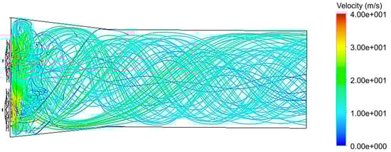 Since the relationship between VP and velocity can be expressed as , where , , is the VP, air density and airflow velocity, the velocity exerts a fundamental influence on the variation of VP. The airflow streamlines of velocity provide a visual expression of movement information in the return airway, as shown in Figure 11. Two parts of airflow out of fans converge, and present spiral lines with circumferential velocity because of the fan rotating blade angle. Complex and intensive streamlines are presented within a certain distance from the fans’ exits, due to the limitation of the tunnel wall and fluid viscous damping effect; and the trend of airflow streamlines vary mildly along the rest of the return airway.