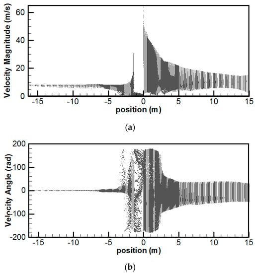 Furthermore, the velocity magnitude and velocity angle distribution in the airways are monitored, as shown in Figure 12. At the position of fans’ exits, the velocity has the widest distribution domain with the range of 0 to 63.8 m3/s, and the velocity angle distribution reaches the maximum symmetrically with the interval of (−178.3°, 187.9°); which indicates that the circumferential velocity determined by the blade angle dominates the airflow direction. In the return airway, the velocity and velocity angle are also altering dramatically in the range of 0 to 3.0 m, and continue to change gently along the rest of return airway; which coincides with the previous analysis. At the outlet, the velocity and velocity angle distribution become (2.4, 15.3) and (−46°, 28°), respectively.