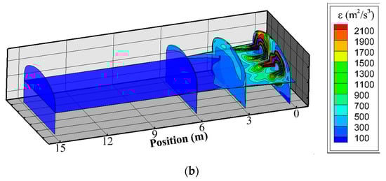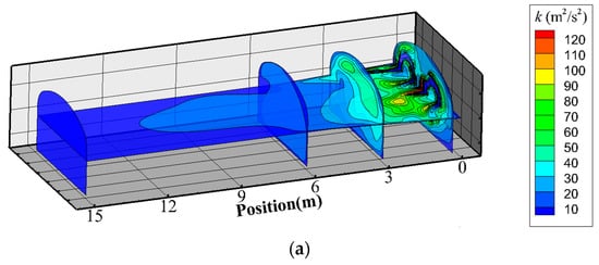It can be found that the airflow forms a vortex movement due to circumferential velocity in the return airway, which always raises a turbulent phenomenon with a strong momentum transfer rate, and the contours of and is shown in Figure 13. The data indicates that the average value reaches the maximum of 49.60 m2/s2 at the position of 1.50 m, which means the top point of turbulent development. In the range of position >3.0 m, begins to vary slowly after a significant decline. Figure 13 also shows that exerts the greatest effect near the fans’ exits, which means the transition rate from kinetic energy to internal energy in viscous fluid reaches a top point; and the value is gradually reduced as the air flows along the rest of the return airway. Similarly, begins to change slowly or maintain a stable state in the range of position >3.0 m. Therefore, the energy loss, due to the turbulent phenomenon, mainly occurs within the range from 0 to 3 m in the return airway.