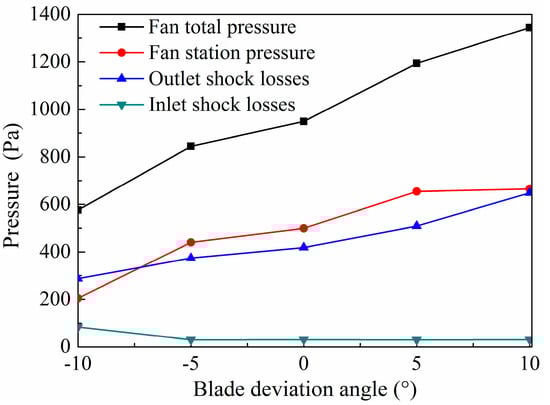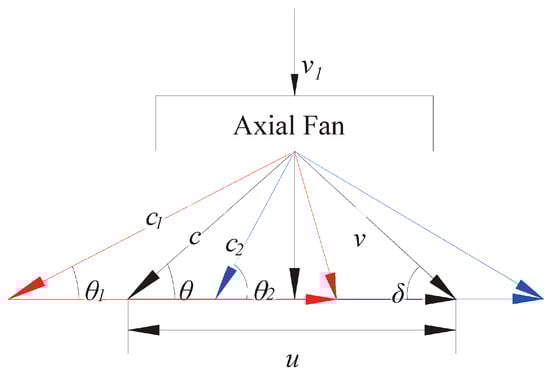 In terms of the inlet shock losses, the resistance varies slightly between 30.12 Pa and 30.95 Pa except for Δθ = −10°, and the resistance rises up to 84.16 Pa when Δθ = −10°. It indicates that the blade angle is relatively small to let the air quantity pass through parallel fans smoothly. In terms of the outlet shock losses, combined with the air velocity triangle in Figure 16, we can find that the remains constant because the fan speed is constant; as the blade angle reduces from to (such as Δθ = −5° and Δθ = −10° in Figure 15), the inclines to the axis direction, and the increases, and the outlet shock losses drop down with circumferential velocity component decreases. Conversely, the outlet shock losses and the circumferential velocity component are developed as the angle increases from to (such as Δθ = 5° and Δθ = 10° in Figure 15).