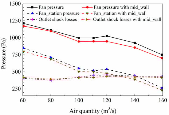 Figure 18 shows the results under different air quantity conditions; it indicates that the average pressures fall slightly in both fans and PFS when the airflow is divided into two parts, and the drop ranges are (11.9, 79.9) and (17.5, 61.8), respectively. However, there is a tiny change between two curves of the outlet shock losses, and the deviation interval is (−32.9, 15.0). Therefore, the mutual interference exerts little effect on the shock losses in the PFS. It also suggests that the approach is useless to form a parallel structure by letting two fans install in different airways, to avoid the airflow interference and reduce the shock losses in PFS.