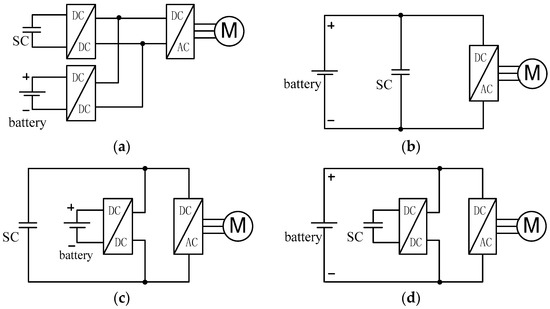 The topology of the electric vehicle HESS: (a) fully active topology; (b) passive parallel topology; (c) semi-active topology 1; and (d) semi-active topology 2.