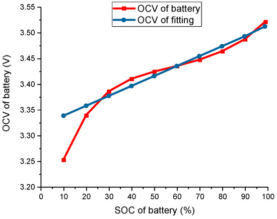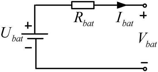 The Rint model shown in Figure 3 was adopted to represent the battery behavior, where Ubat is the battery terminal voltage and Rbat is the resistance of the battery. Since the voltage and SOC are strongly correlated [19] in Equation (1), and in order to adopt the subsequent power distribution strategy, the one-time curve fitting is used to find the functional relationship between the battery open circuit voltage Vbat and its SOC, as shown in Figure 4.