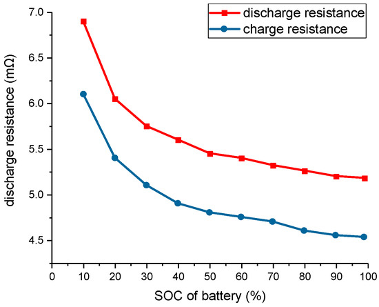 The power consumption on battery internal resistance Pbat_loss can be calculated by the following equation, where Ibat is the current flowing through the battery cell. The charge resistance and discharge resistance of the cell are measured under different SOCs at a room temperature of 25 °C, as shown in Figure 5.