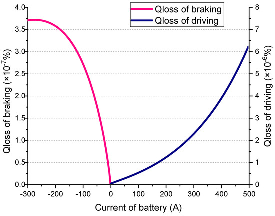 In order to reduce the computation time in the convex optimization, as shown in Figure 7, the relationship between the battery current Ibat and the battery degradation percentage Qloss is determined at room temperature 25 °C based on Equation (9). Irrespective of the braking or driving modes, Qloss always increases as the charge or discharge current Ibat increases. Hence, the optimization of the entire driving cycle of battery degradation can be equivalent to optimizing the entire driving cycle of the battery current in the absolute value. There is the following relationship: