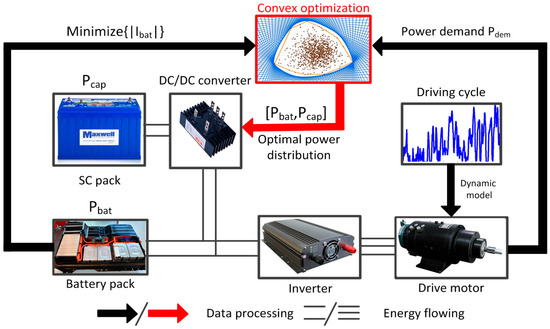 The implementation process of the convex optimization strategy used in this study is shown in Figure 8. In order to satisfy the constraints on the number of battery cells and SC cells in Equations (14) and (15), the number of selected battery and SC cells is nbat = 120 and ncap = 240, respectively. The battery pack and SC pack in the HESS are all grouped by n series and one parallel connection, and the unbalance between the cells is ignored [27]. As the energy source of the vehicle, the LiFePO4 battery pack is not only for the drive motor to provide energy, but also for the super capacitor when SOCcap is low. The SC pack is between the LiFePO4 battery pack and the drive motor, acting as an energy and power buffer, and absorbing the braking energy from the drive motor during braking.