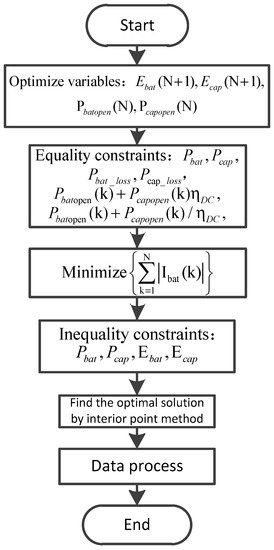 In this study, we use Equation (18) as an optimization target, and the battery pack energy Eb, SC pack energy Ecap, battery pack port output power Pbatopen, and SC pack port output power Pcapopen as the convex optimization variables. The battery pack power Pbat, SC pack power Pcap, battery pack power loss Pbat_loss, and SC pack power loss Pcap_loss are used as the equation constraints of the convex optimization. The overall optimization function is given in Table 4.