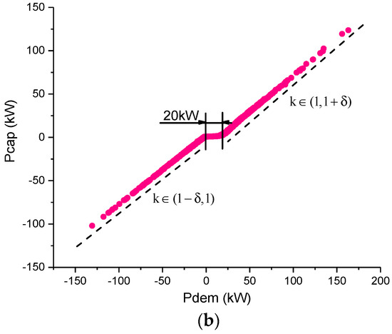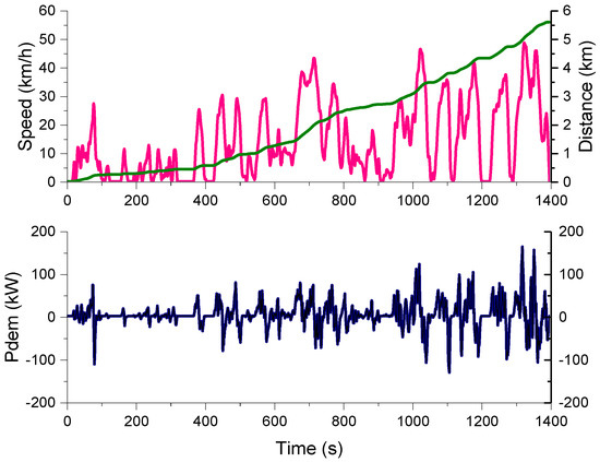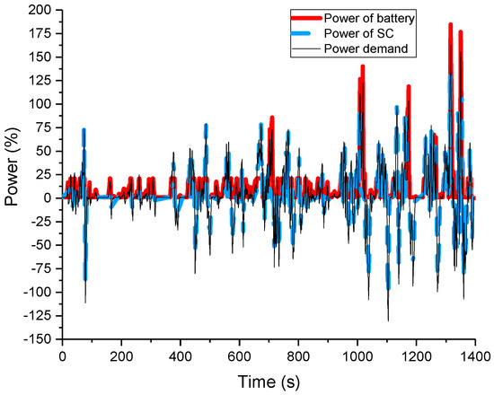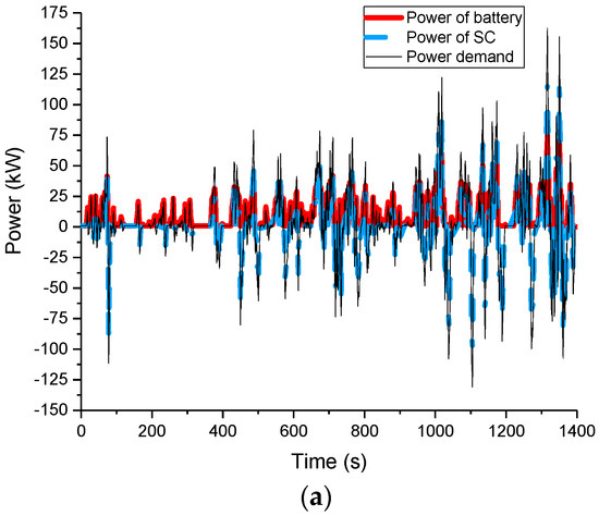 Through the driving cycle, we can calculate the power demand of the bus at every step. In the driving mode, the required power Pdem should be the output power of the drive motor on its output shaft. The electrical power output on the DC bus is equal to the motor output power plus the motor power loss, which is obtained by the fitting. The electrical power output on the DC bus at this time is the total power to be satisfied by the batteries and the SCs (considering the efficiency of DC/DC converter).