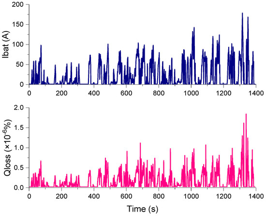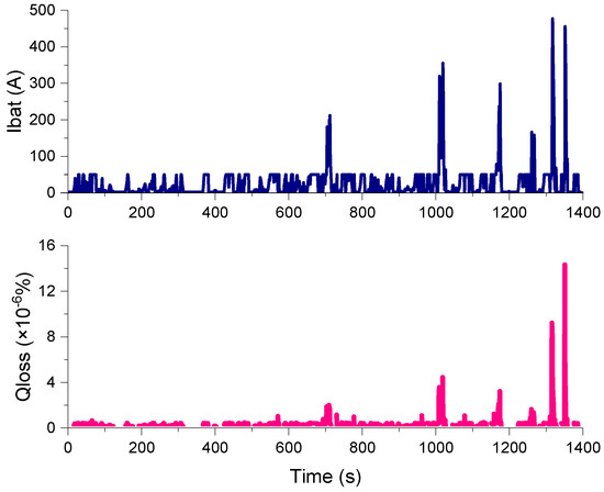 Figure 12 shows the battery current and battery degradation percent at a room temperature of 25 °C based on convex optimization. In the latter part of the driving cycle, the acceleration/deceleration of the vehicle is violent; hence, the battery current undergoes greater fluctuations. However, the maximum value of the battery current does not exceed 200 A. The battery runs within 1C discharge magnification rate altogether. In addition, according to the relationship between the battery charge/discharge current Ibat and the battery degradation percentage Qloss in Figure 7, it can be observed that the battery current has approximately an exponential relationship with the battery degradation percentage Qloss when the battery current is greater than zero. Therefore, Qloss obtained in Figure 12 is more intense than the battery current fluctuation. At room temperature of 25 °C, the battery degradation percent in one driving cycle is 2.16 × 10−4%.
