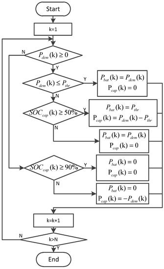 In order to verify the effectiveness of the proposed optimization method in this paper for the electric bus equipped with semi-active HESS, it is compared with the rule-based strategy in Harbin driving cycle. The rule-based strategy is shown in Figure 13 [9,29]. When the power demand Pdem ≥ 0, the battery only provides the threshold power Pthr, and when Pdem > Pthr, the battery will provide the part of power demand exceed according to the SOCcap. When the power demand Pdem < 0, it is also need to charge for SC according to the charge of state of the SC, when the SC pack is fully charged and then to the battery pack for energy braking. According to the characteristics of the SC power and the power demand relationship obtained from the convex optimization, the threshold power Pthr in the rule-based strategy is set to 20 kW, and the same power system model and initial parameters are used to calculate the power distribution based on the rules strategy, as shown in Figure 14.