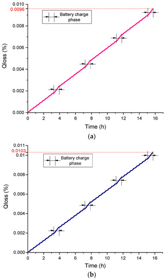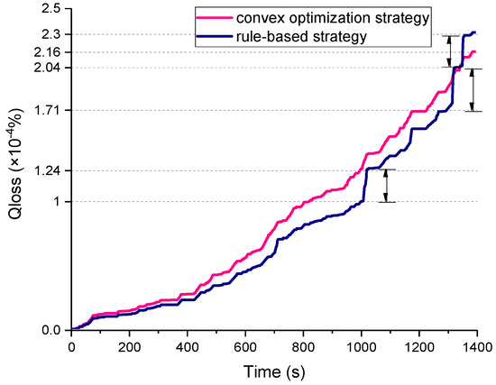 The battery capacity degradation will occur during the entire charge/discharge process. Therefore, we can obtain the battery degradation percentage curve of the battery pack using the semi-empirical model in one day according to the battery charge/discharge situation. At room temperature of 25 °C, Qloss base on the convex optimization strategy and the rules strategy are shown in Figure 18. After a day of operation (four cycle lines and four charging phases), Qloss based on convex optimization is 9.6 × 10−3%, and the battery pack can be used for approximately 2.08 × 103 days when the battery degradation is attenuated to 80% of its initial capacity, whereas Qloss based on rules strategy is 10.3 × 10−3%, and the battery pack can be used for approximately 1.94 × 103 days when the battery is attenuated to 80% of its initial capacity.