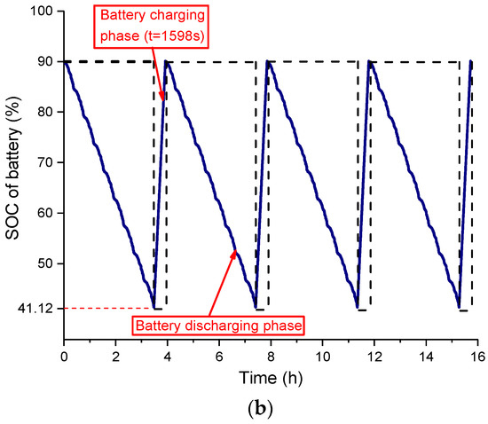 The battery SOC change based on different power distribution strategies in one day: (a) the battery SOC based on the optimization strategy described in this paper; and (b) the battery SOC based on the rules of the power distribution strategy.
