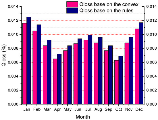 As evident in Figure 19, Qloss in different months based on the rules strategy is larger than that based on the convex optimization strategy. It can also be observed that, when the temperature is within ±10 °C during spring and autumn, Qloss is minimal, whereas Qloss is large in summer and winter with higher or lower temperatures. Especially in the winter months of December, January, and February, the two strategies under daily operation of the battery degradation reached ≥ 0.01%. This directly reflects the problem of large degradation of LiFePO4 battery at low temperatures. The total battery degradation percentage of the year is shown in Table 7.