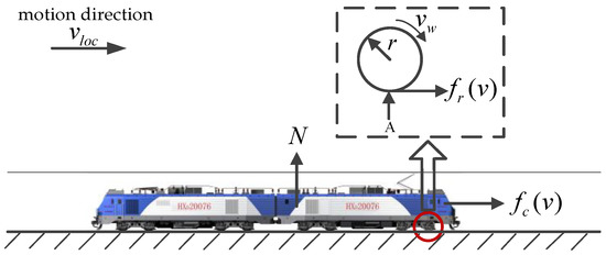 where N is equal to the weight of the locomotive, is the rolling friction coefficient of the wheel. It is necessary to point out that is from a number of field tests [36], i.e.,