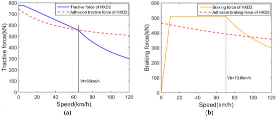 Traction/Braking force and adhesion force of a locomotive (HXD2): (a) traction force and adhesion force; (b) braking force and adhesion force.