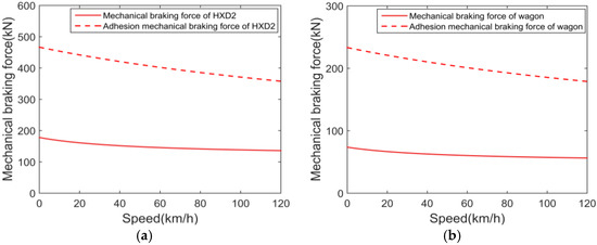 In Figure 3, the adhesion force is greater than the mechanical braking force. For a freight train along the track, the mechanical braking force isn’t influenced by the adhesion force. The real mechanical braking force can be described [36] using the following expression: