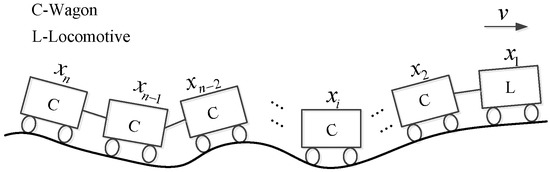 The freight train model is proposed in this section. Every wagon in the freight train can possibly run on a section of track with a different gradient. For an example, the front wagon may run on an uphill section while the middle one is on a downhill section. Therefore, a multi-particle model of a freight train is more appropriate in this paper instead of a single-particle one. The train marshalling with one locomotive and n − 1 wagons is shown in Figure 4.
