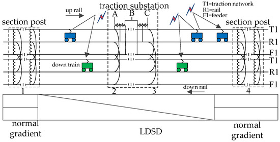 - In most electric trains, the regenerative braking energy can be fed back to the traction power supply system if other trains along the railway line could utilize it. Currently, freight trains are not equipped with on-board energy storage devices. Hence, the regeneration efficiency is decided by the availability of other trains. In the realistic traction power supply system, the regeneration efficiency is a variable. The railway operation scheme (including the timetable and number of freight trains that are running along the railway line) should be investigated to obtain the accurate regeneration efficiency. Based on the operation data in months or years, we could calculate the regeneration efficiency. In China, the railway electrification system is 2 × 25 kV alternating current (AC) single phase with a frequency of 50 Hz. Two phases of the three-phase AC power from the public power grid are used to supply for the electric trains. The phases at different feeders of the substations will be switched between A–C, C–B, B–A, to maintain the overall balance of the public power grid (see Figure 5). Since the double-track railway including up rail and down rail is very common in China, the traction network of up rail and down rail connects in parallel. We can optimize the timetable to make the up train and down train run on the same LDSD section. For example, for a fully loaded train that is running on the up rail of the LDSD section, if electrical braking is applied, the electricity generated by the up train will be fed back to the traction network. At the same time, if the down train with empty wagons is going uphill with power on the LDSD section or the fully loaded up train is powering on the normal gradient (see Figure 5), of the energy generated by up train will be absorbed by the down train.