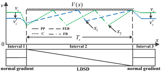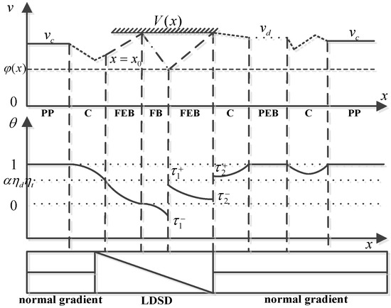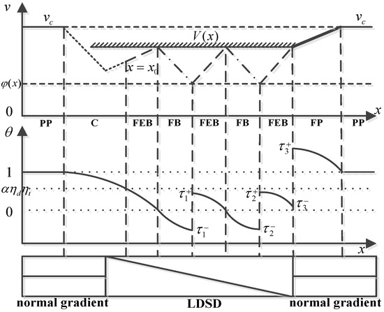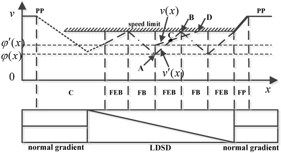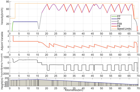 In Figure 16, , the operation time is 5704.20 s (≈ 95 min), more details are shown in Table 3. At the origin location, the initial adjoint variable () is large and it’s decreasing quickly with the location of the train increasing. Here, ranges from −1 to 2. The optimal controls are decided by the value of the adjoint variable. For an example, if declines from 1 to , then the optimal control switches from PP to C. Applying coasting before entering the LDSD section makes the freight train operation more energy-efficient because more potential energy is converted to kinetic energy. While the train is running on the LDSD section, FEB and FB are applied alternatively because of the jump of the adjoint variable. The force that varies with location of the train is also shown in Figure 16.