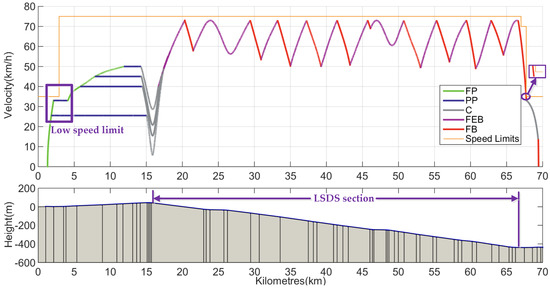 Now we obtain four optimal trajectories by using the multi-particle model of the freight train. At the start phase, the freight train is running with FP. The velocity of the freight train must be kept less than the speed limit (2 km/h below the speed limit). To prevent the rear of the freight train from exceeding the speed limit, the velocity is accelerated until the last wagon passes the low speed limit (see Figure 14). To make the train operation energy-efficient, the optimal control should be switched from PP to C before entering the LDSD section. In the LDSD section, periodic braking is applied and the optimization trajectories are the same under the four groups of given time because the jump condition (see Section 4.2 and Section 4.3) should be satisfied. The simulation results of the optimization algorithm are listed in Table 3.