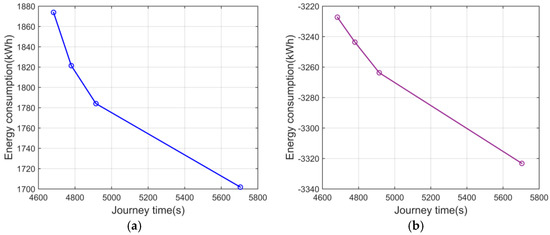 In Figure 15a, the traction energy consumption drops down while the trip time of the train increases. Less energy is consumed if the train runs more slowly. It seems the train driver should drive very slowly. However, from the railway system’s perspective, reducing the journey time not only allows more freight trains to operate on the railway line, but also creates more economic benefit. Dispatchers of the railway should make a compromise between the energy consumption and the trip time.