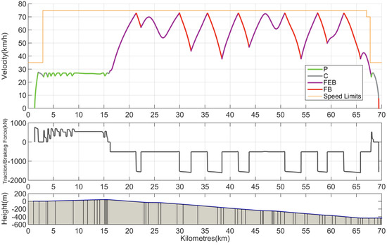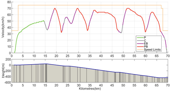 We obtained the field operation data from Yanqing to Chawu, which consists of the train speed and location. The journey time is 95 min. The speed profile is shown in Figure 18 with P = Power, EB = Electrical Braking, PB = Pneumatic Braking.