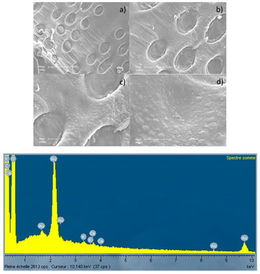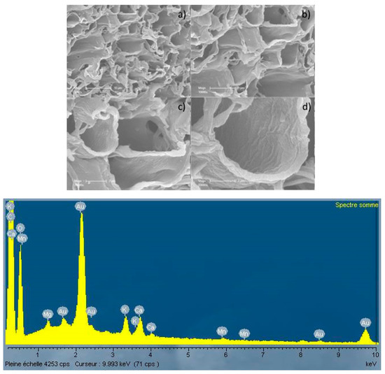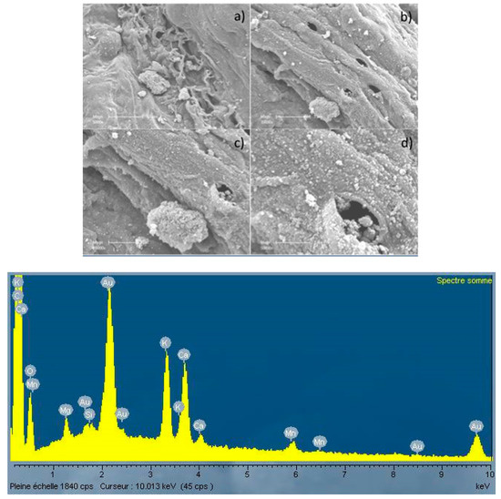 Figure 5 and Figure 6 show the surface of the chars obtained at 1200 and 1400 °C respectively. These photographs clearly show the modification of the particle surface shape at these temperatures due to sintering. At high enlargement (×50,000) small particles at the surface of the chars can be observed (Figure 4d and Figure 5d). Analysis of the surface (EDX cartography—not shown) indicated that these particles contain only carbon, and no minerals. For the char obtained at 1200 °C, the amounts of Ca and K increased (with peak intensities comparable to that of Au) significantly, but the surface didn’t present cracks or macropores (Figure 5d). Small amounts of Mg and Mn were also observed on these samples.