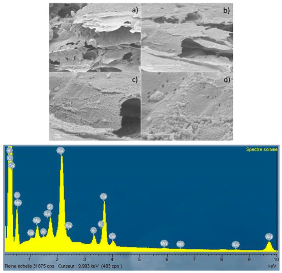 SEM photographs and X-ray fluorescence analysis of the surface of the biochar produced after pyrolysis of wood particles at 600 °C and different enlargements (a) ×5000; (b) ×10,000; (c) ×20,000; and (d) ×50,000.