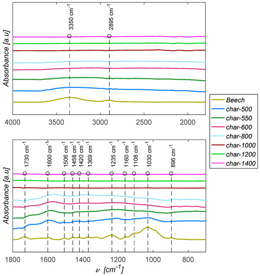 Noticeable changes can be observed in the spectra of the chars compared to the raw wood. The OH band (around 3350 cm−1) decreased significantly, starting with the char-500. The peak at 1730 cm−1, related to the presence of carbonyl groups of esters and uronic acids in the xylan of beech wood progressively disappears as temperature increases. These functions belong to the hemicelluloses of beech wood, which have the lowest thermal stability [19].