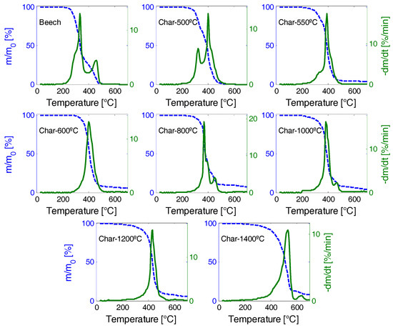 Considering the experiment done on beech wood as reference, the mass loss below 300 °C decreases as pyrolysis temperature increases, indicating lower proportions of low, thermally stable components (reactive carbonaceous structure, incompletely pyrolysed wood) in the chars. The chars prepared at 500 °C and 550 °C (to a lower extent) show peaks (a maximum of degradation rate) at a relatively low temperature of 325 °C, probably indicating the presence of unconverted wood. The final residual mass increases with pyrolysis temperature, which was foreseeable, given that char obtained at higher temperatures has higher mineral content.