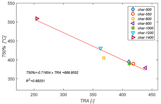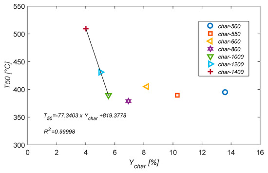 Evolution of T50% with the char yield.