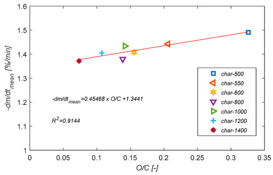 Mean mass loss rate of the char in the TG air oxidation experiments as a function of O/C atomic ratio.