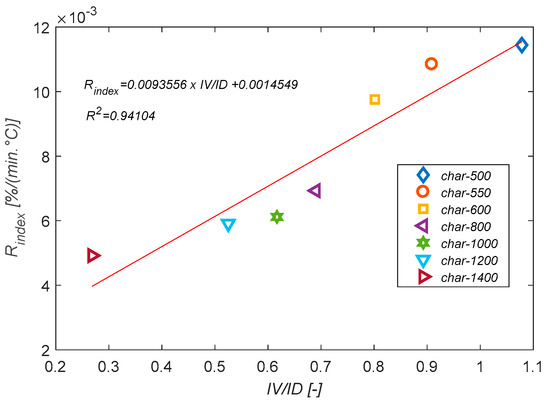 Reactivity index can also be correlated to the IV/ID structural ratio, as shown in Figure 13. This evolution here again makes sense, as the more reactive and amorphous small aromatic structures char contains, compared to condensed structures, the higher its reactivity.