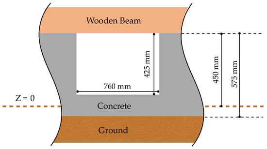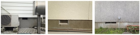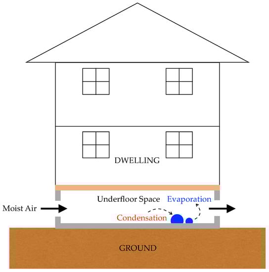Figure 1. The height of the underfloor space is 0.3–0.5 m from ground level. As openings are dispersed around the underfloor space for natural ventilation, outdoor moist air flows into the underfloor space, which gives rise to condensation and evaporation. The bottom of the underfloor space is usually paved with concrete and the ceiling, which is directly underneath the indoor occupant zone, is made of wood.