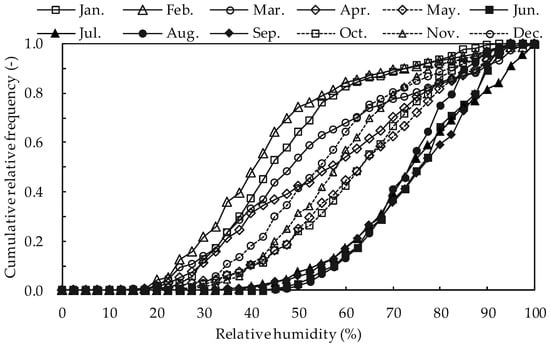 Figure 3 shows the correlation of the cumulative relative humidity per month in Tokyo. The wettest months of the year are June to September and a high-humidity climate prevails for more than half of this period, with the relative humidity being more than 75%.