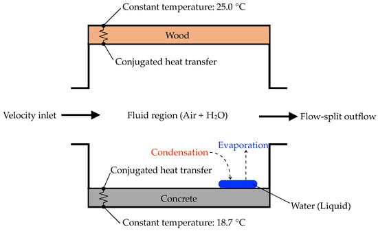 We confirmed the influence of the difference in the humidity when the outdoor wind speed was assumed 1.0 m/s and the outdoor air flowing into the room remained constant according to the calculated ventilation rate. In the instance of a RWS value of 1, evaporation occurred actively and the evaporation rate was 12.3 mg m−2 h−1. The total volume of the internal evaporation rate was 726 mg/h. The evaporation phenomenon did not occur in a condition of 0–70% humidity, where the value of RWS was 0 and the entire surface was dry. When humidity was high at 90–100%, the total condensation rate of the underfloor was 0.03 g/h.