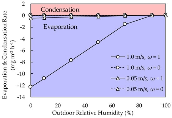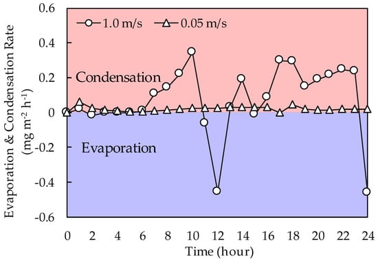 When the outdoor wind speed was 1.0 m/s and the outdoor environmental conditions fluctuated for 24 h, the outdoor humidity remained high and condensation continued. However, with the temperature rising or humidity decreasing, evaporation occurred between 11:00 and 12:00, and at 24:00. The maximum condensation rate was 0.34 mg m−2 h−1 at 10:00 and the maximum evaporation rate was 0.46 mg m−2 h−1 at 12:00 and at 24:00.