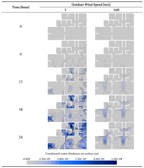 Figure 17, at a wind speed of 1.0 m/s, condensation did not occur where the airflow is strong, but did occur nearby the mainstream of the strong airflow, and was likely to occur in the corners of the underfloor space. However, in the northern zone, where the airflow does not reach, condensation hardly occurred at all. The evaporation phenomenon was likely to occur in an area of strong airflow, as mass transfer easily occurred and condensation rarely occurred. In addition, the convective heat transfer from the surface was more pronounced because of the strong airflow when the outdoor air flowed in; therefore, condensation was less likely to occur. In contrast, in a stagnant condition of 0.05 m/s wind speed, condensation occurred mostly near the zone where the airflow was generated. This is because the velocity of the incoming airflow was extremely low and the convective heat transfer on the surface was not large; therefore, the moisture of the incoming outdoor air condensed at the area where the airflow was formed.