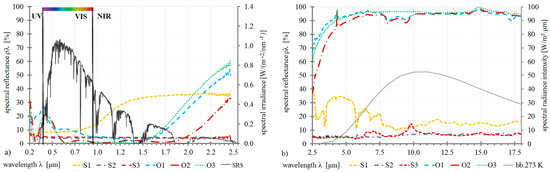 The results of the measurements are spectrally presented in a range from 200 nm to 20 μm (Figure 1). The graphs represent all thermal regions of the spectrum. The spectral irradiance curve of the solar radiation spectrum is shown in the UV/VIS/NIR results, while the curve for the spectral radiance intensity of a 273 K black body (bb273K) represents the weighted function for the determination of emissivity in the results of the longwave infrared radiation range. Figure 1 present the results of spectral reflectance in the solar and longwave radiation spectrum respectively. The results of the spectral reflectance analysis are finally evaluated as thermal emissivity and solar absorbance values (Table 4) according to the method in [48].