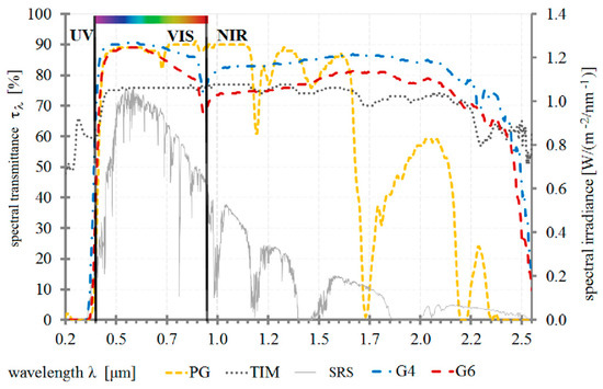 Several studies aimed to measure the directional-hemispherical (also sometimes called direct-diffuse) solar transmittance for various honeycomb-type structures with an indoor solar simulator and a 40 cm diameter integrating sphere for incidence angles up to 70° [49,50]. In this relation, outdoor measurements using the sun as the source might be the option. Platzer [49] pointed out that it is not an option for Central European climates. Although there are many specific issues to take into account, such as inclined angular dependence, fluctuations of solar irradiation and overall solar distribution as well as cardinal point aspect, we employed the using of solar transmittance estimating by real outdoor measurements. This is already implemented in standard test method for solar transmittance of sheet materials using sunlight with detailed specification and procedures according to ASTM E1084-86(2015) [51]. Overall, there is lack information regarding real outdoor measurements in literature as typically used for solar transmittance measurements. Therefore, this may represent very simple and well available way of measuring the total solar transmittance parameter. Finally, combinations of two separate methods of spectral and total solar transmittance quantification were compared with each other due to a specific property of applied transparent insulation, where an aspect of diffuse solar radiation transfer appears to play a significant role. The first method takes the form of laboratory testing based on spectrophotometer measurements. Again, a PerkinElmer Lambda 1050 UV/VIS/NIR spectrophotometer was used. The spectrally obtained results are presented in Figure 2, where the measurement data for the analyzed TIM is primarily supplemented with other transparent materials, such as Plexiglass (PG), simple glass pane 4 mm thick (G4), simple glass pane 6 mm thick (G6) and TIM based on honeycomb structure.