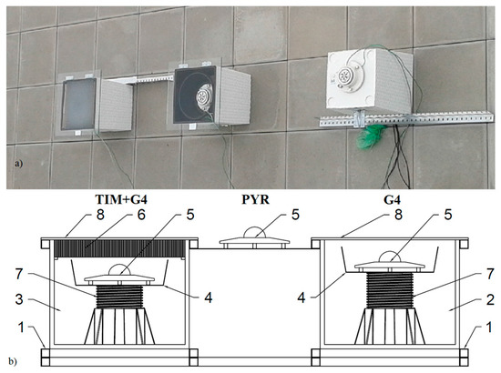 Total solar transmittance outdoor setup; (a) TIM + G4 and G4 test boxes and standalone PYR sensor; (b) proposed testing scheme: (1) measurement apparatus; (2) reference box; (3) metering box; (4) round bowl; (5) solar radiation intensity sensor; (6) measured sample space; (7) height adjustable screw; (8) protective layer, glass pane.