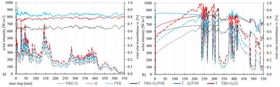 Total solar transmittance results based on outdoor testing; (a) overcast; (b) almost clear sky, (notes: TIM—transparent insulation material; G—glass pane; PYR—pyranometer; T—total solar transmittance as a ratio of two box configurations).