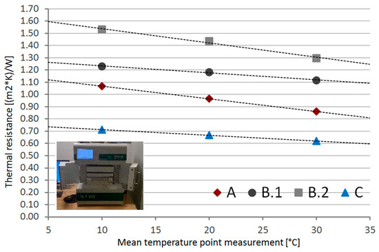 Four samples of proposed components (Table 3) based on applied materials (Table 2) were measured. Table 2 and Table 3 present basic material parameters. Finally, the equivalent thermal conductivity coefficient λekv is calculated based on whole component thickness and its thermal resistance (Equation (5)). Three measurement cases were tested at different mean temperature levels: 10 °C, 20 °C and 30 °C. The load imposed by the top plate on the sample was 200 N for all cases. In addition, the temperature dependency between the thermal resistance and the mean temperature of the sample was observed. The resistance approximated by linear function indicates the same tendency of slope: the higher the temperature level, the lower the thermal resistance of all tested samples (Figure 5):