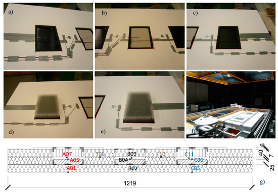 Tested absorber surfaces, transparent insulation application and final tested setup, (a) component with selective metal sheet; (b) gypsum board surface without finishing; (c) component with black painted metal sheet; (d,e) transparent insulation applying; (f) test setup exposed by solar simulator; (g) test setup model and its sensor positioning, thermocouples (TC) installed between layers, on interior and exterior surfaces. Thermocouples are located in the middle of each component.