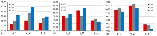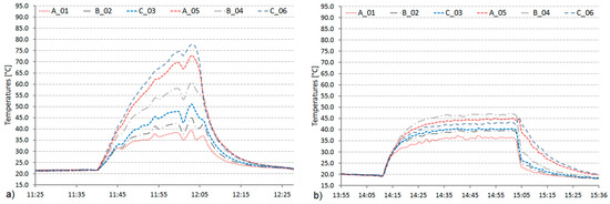 Temperatures are measured by 16 thermocouples (Type T, NBS special limits of errors, 30 AWG). Figure 6g displays the measurement model with all sensor locations. The total temperature progression is monitored for each position in relation to the proposed components, though two material interfaces are primarily analyzed. Although several positions were measured, the surface absorber temperatures and those located behind the gypsum boards are presented and analyzed in detail here. First monitored level represents temperatures behind heat accumulation layer, particular positions are A_01 (test sample A), B.1_02 (test sample B.1) and C_03 (test sample C), whilst second corresponds to the absorber surface temperatures at positions A_05, B.1_04 and C_6. Table 7 summarizes and Figure 7 shows the averaged temperatures monitored during all tested cases for each component respectively. In addition air cavity temperatures are presented.