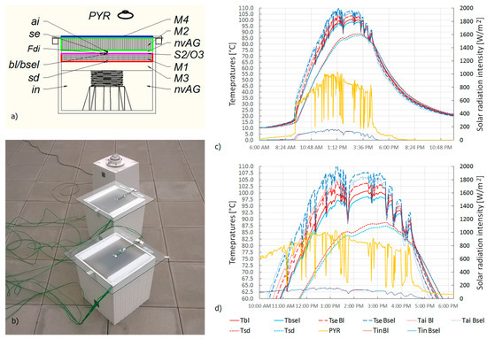 The same apparatus as was proposed for total solar transmittance measurements (Figure 3) was additionally used to contrast measurements obtained from the solar simulator and outdoor testing, both at the small-scale level. The only difference is that one whole proposed model integrating all the elements underwent solar simulator testing, whilst in the outdoor tests both of the assembled concepts (not including the conventional type) were tested separately. The measurements were carried out during real outdoor solar radiation exploitation. Identical A and C samples were fabricated, placed into the test boxes and exposed to the outdoor climate. The test scheme and experimental setup are shown in Figure 9a,b. One reference case and a second comparative case were measured. Again, the only difference between both boxes was in terms of the absorber used, with non-selective black paint S2 and selective material O3 being contrasted. All of the materials are based on Table 2. Six measurement points are monitored and finally analyzed in the results section. The interpretation of all given measurement points is: ai represents the air temperature of the non-ventilated air gap, se is the surface absorber temperature, bl/bsel corresponds to the material interface between the absorber and the heat accumulation layer (for this study it is gypsum board), sd is the temperature behind the gypsum board, in represents the temperature inside the box and PYR is the outdoor solar radiation intensity obtained by the pyranometer sensor, whilst Fdi is its transmitted part through the TIM obtained by the photodiode element. The total temperature progression is monitored for a period of one whole day. The results are presented in Figure 9, both for a whole day (Figure 9c) and the maximum peak (Figure 9d) of the presented day. Not surprisingly, the maximum level of the measured temperatures is more than 100 °C, thus the solar radiation received and transferred into the thermal energy has huge potential. Here the difference between the non-selective and selective absorber is approximately 2.5 K at the maximum peak. This basically corresponds to the measurements obtained for case c_3 during solar simulator testing. The maximum temperature level is different, however. The absorber temperature at the center of the prototype reached a maximum of 107.5 °C at maximum peak when the incident solar radiation reached its maximum of around 1000 W/m2 and the ambient outdoor temperature was around 25 °C. At this moment, the corresponding TIM temperature measured at the center of the façade prototype reached a maximum of 107.5 °C which is below the maximum resistance temperature of the TIM (around 140 °C).