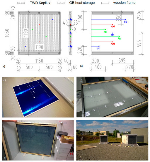 The overall results of the laboratory, solar simulator and small-scale outdoor testing were applied in the measurement of full-scale outdoor thermodynamic performance. All testing periods are specified in the thermodynamic performance analysis of the time-transient summer period. A full-scale test sample was designed (Figure 10), after which a 1.19 m × 1.19 m test prototype (Figure 10) was built using the system based on the Kapilux TWD transparent insulation fitted with honeycomb transparent PMMA-based insulation with a different solar absorber type, and tested outdoors. The TWD system is double low-e glazing incorporating honeycomb PMMA transparent insulation with air cavity. The declared thermal and optical properties are as follows: thermal transmittance Ug is 0.7 W/(m2K), total solar energy transmittance or solar heat gain coefficient is 61% and light transmission is 70%. The type of transparent insulation directly incorporated in glazing system represents the only difference as compared with small-scale prototypes. Figure 10 shows the geometrical parameters of the prototype, the positions of all sensors and key illustrations of their construction phase. As demonstrated in Figure 10, this prototype may allow to implement a ventilation function, however in this study it has not been applied. The last illustration (Figure 10f) presents the prototype’s outdoor installation in two identical wall brick boxes with 50 mm thick thermal insulation, in which both samples, a reference and comparative one, were installed facing south at the AdMaS Centre at Brno University of Technology. (longitude 16°34′, latitude 49°14′, altitude 297.23 m). More detailed information about the test boxes can be found in [55]. Measurements were taken at six positions along the test sample, with each interface being on a diagonal line consisting of three sensors. Temperatures were measured by Pt100 sensors (Type CRZ 2005-100, class A, tolerance 0.15 + 0.0002t). Again, as previously mentioned, similar indexes were used to recognize the particular position measured, though they primarily focused on the material interface between the absorber and the heat accumulation layer (gypsum board). First, the internal surface temperatures of tested samples si were measured, and second, the internal space temperature of each full-scale box in. In addition, silicon pin photodiodes Fdi were installed inside the air gap to monitor solar radiation behind the TIM incident at the absorber level Figure 11. The monitoring of outdoor ambient temperature Tae and the solar radiation intensity inside the air gap Fdi represent an important part of the testing in relation to this stage of the presented analysis. The outdoor temperature varied from 15 °C to more than 30 °C. Solar intensities behind the TIM reached more than 200 W/m2 in the area of the solar absorbers.