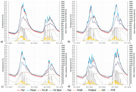 Full-scale test results of one-week period; (a–d) Temperature measurements behind absorbers and internal surface temperatures of tested components.